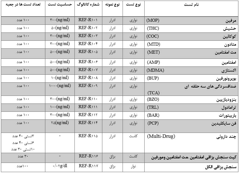 برای اطلاعات بیشتر در مورد تست Multi-Drug ، AMP ، BUP ، COC ، MDMA ، MET ، MOP ، MTD ، PCP ، TCA ، THC ، TRL و تست بزاقی می توانید بر روی گزینه های زیر کلیک کنید و بروشور آن ها را مطالعه نمایید.
