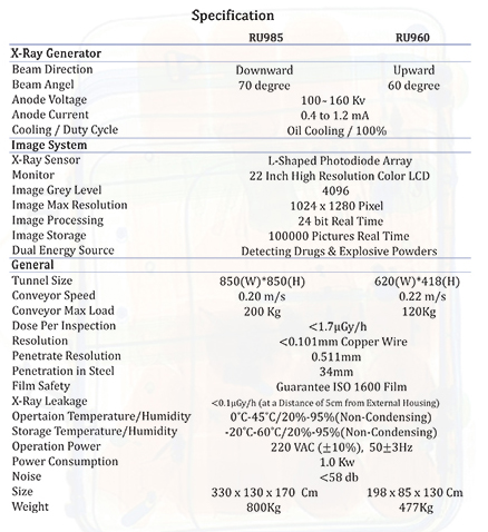 مراقبت و بازرسی در درگاه های وروودی کشور به صورت دقیق از الزامات مسایل امنیتی بشمار می رود و این امر در فرودگاه ها و گمرکات کشور عمدتا بوسیله دستگاه بازرسی ایکس ری انجام می پذیرد . دستگاه های بازرسی مدل RU985-RU962 مطابق با آخرین تکنولوژی های بدست آمده در این زمینه طراحی و ساخته شده است.