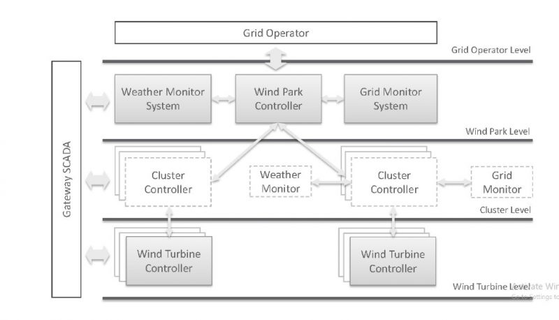 سلسله مراتب سیستم کنترل کنترل پارک بادی در تصویر زیر نشان داده شده است. این سیستم به سه سطح تقسیم میشود. توربین بادی، کلاستر و سیستم پارک. سطح اپراتور شبکه نیز تنها جهت نمایش ارتباط کنترلر پارک با آن ارایه شده است.