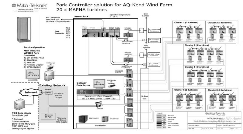 سیستم کنترل پارک بادی میتا تکنیک شامل مجموعه سخت اقزار و نرم افزار می باشد که کنترل توان اکتیو، کنترل توان راکتیو، کنترل ولتاژ، پاسخ فرکانس و دیگر فانکشن های مرتبط را فراهم میسازد. این سیستم قادر است پارک بادی بالغ بر 2500 توربین بادی را کنترل نماید.