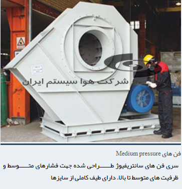 فن های سانتریفوژ فشار متوسط شرکت سیستم هوا از 10 گروه از جمله انواع بالها و پروانه ها با عرض های مختلف تشکیل شده است.