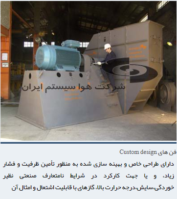 فن‌های سانتریفیوژ هوا سیستم ایران به صورت Heavy Duty و مناسب جهت کارکرد در شرایط خاص صنعتی طراحی و ساخته می‌شوند. فن‌های Custom design به صورت خاص جهت کارکرد در شرایط نامتعارف نظیر هنگامی که گاز ورودی به فن دارای درجه حرارت بسیار بالا بوده ، و یا هنگامی که ظرفیت و فشار درخواستی بسیار بالا باشد طراحی می‌شوند.