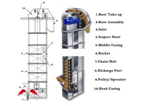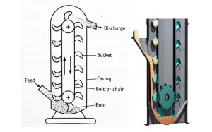 مکانیزم عملکرد این سیستم بسیار ساده بوده ، موتور و گیربکس مربوطه باعث به حرکت در آمدن درام یا چرخ زنجیر شده درنتیجه باکت های متصل به زنجیر یا تسمه حرکت کرده و در پاشنه الواتور )محفظه پایین الواتور( باکت ها پر شده و در راس الواتور )بالای الواتور( مواد تخلیه میشوند. تخلیه مواد در انتهای الواتور میتواند بر اثر نیرو گریز از مرکز و یا نیروی گرانش انجام پذیرد.